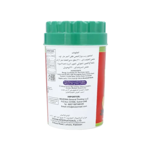 Mango, Sunflower Oil, Red Chilli, Garlic, Acetic Acid (E-260), Salt, Fenugreek Seed, Fennel Seed, Turmeric, Carom Seed, Cumin Seed, Coriander, Nigella Sativa, Citric Acid (E-330) & Mustard Seed.